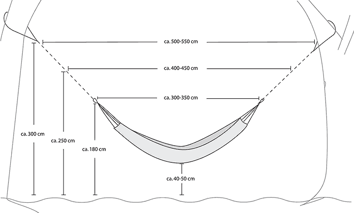 Die Aufhängung einer Hängematte ist im wesentlichen abhängig von der Länge der Hängematte und ob es sich um eine Hängematte mit oder ohne Stab handelt. Die hier angebotene Information soll Ihnen für Hängematten ohne Stab mit einer Länge von ca. 360 cm gedacht. Für größere Hängematten ist der Abstand dementsprechend zu verlängern. Hängematten ohne Stab lässt man tief durchhängen. Die Aufhängeschlaufen der Hängematten werden etwa in Kopfhöhe und ca. 3m voneinander entfernt angebracht.